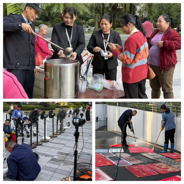 细致入微,便民清洁在行动。11月22日下午,悦珑郡物业服务中心想业主所想,组织了“风扇&地毯免费清洗”便民服务活动。活动预告一经发出,便受到业主们的热烈欢迎。活动现场,物业工作人员有条不紊地登记、编号、清洗、晾晒,将业主家中使用一夏的风扇以及日常踩踏的地毯进行专业、彻底的清洁。这项服务不仅免去了业主自行清洗的烦扰,更在细微之处彰显了物业服务的周到与用心,让家居环境焕然一新,为冬日增添了一份洁净与舒适。