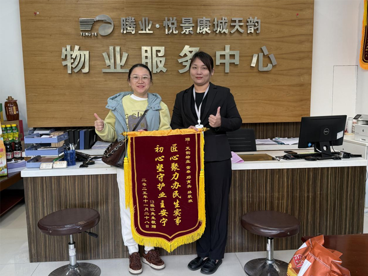 天韵项目物业团队以业主满意为目标,以责任担当为支撑,通过高效贴心的服务解决业主需求,赢得广泛认可。业主赠送锦旗是对整体服务工作的肯定。未来团队将继续优化服务、提升品质,以专业能力和务实行动守护业主生活,营造温暖安心的小区环境。