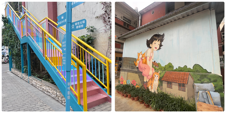 视觉焕新:从灰暗到斑斓。走进城中新街,首先映入眼帘的是那道“彩虹阶梯”——原本灰暗的楼梯被刷上从绯红到明黄、浅蓝至柔紫的渐变色,每一级台阶都像被阳光吻过,成为打卡的活力地标。当光线穿过扶手洒落巷间,整条街道都仿佛被点亮。转身望去,曾经的单调墙面已被一幅童话墙绘覆盖:穿粉裙的小女孩与一只慵懒的橘猫,在青瓦屋顶与缤纷花丛间相视而笑。这幅充满故事感的画面,让匆匆路过的人们不禁放慢脚步,感受片刻治愈。就连那些不起眼的小木屋,也经过翻新披上鲜亮外衣,错落分布如从绘本中走出,等你推开木门,发现惊喜。